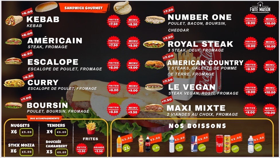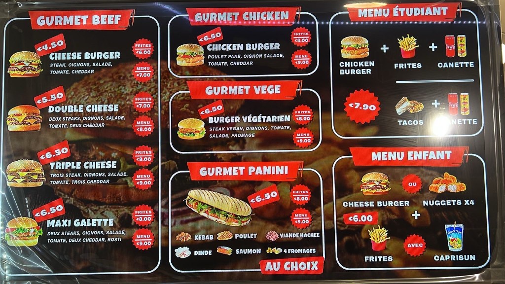 8 € (Menu) | 7 € (Frites) | 5,50 € (Seul)